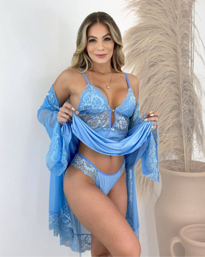 Conjunto Majestade Camisola + Calcinha + Robe em Tule e Renda